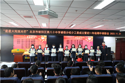 11月21日,在星星火炬的照耀下,北京市第八十中学睿德分校初一年级的少先队员与家长代表们齐聚一堂,共同见证少工委的成立和初一年级期中表彰会的盛况。